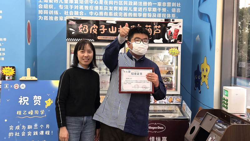 2025年12月18日,上海罗森与上海爱好儿童康复培训中心联合开展的“大龄孤独症社会实践课程”第二期课程圆满落幕。当天下午,一场温馨而简单的结业仪式在罗森实践门店内举行,参与本期课程的学员小峰同学顺利完成了他为期三个月的学习与体验。